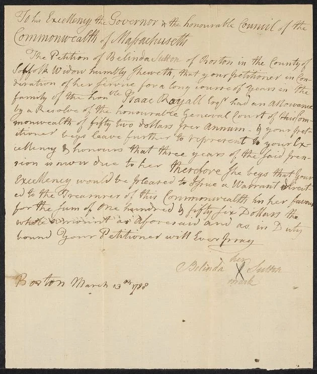 Belinda Sutton was an African woman enslaved by the Royall family - a prominent family of New England whose wealth from the International Slave Trade contributed to the first law school professorship at a prominent univeristy. Belinda is significant as one of the first documented records of a former enslaved person seeking money owed after her manumission, an early discourse around reparations in the Massachusetts courts.