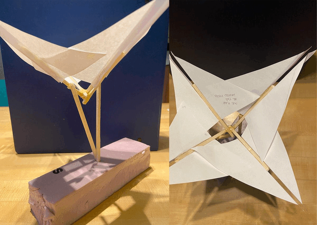 Early iterations of the canopy to define preferred fabric patterning and structural support needs.